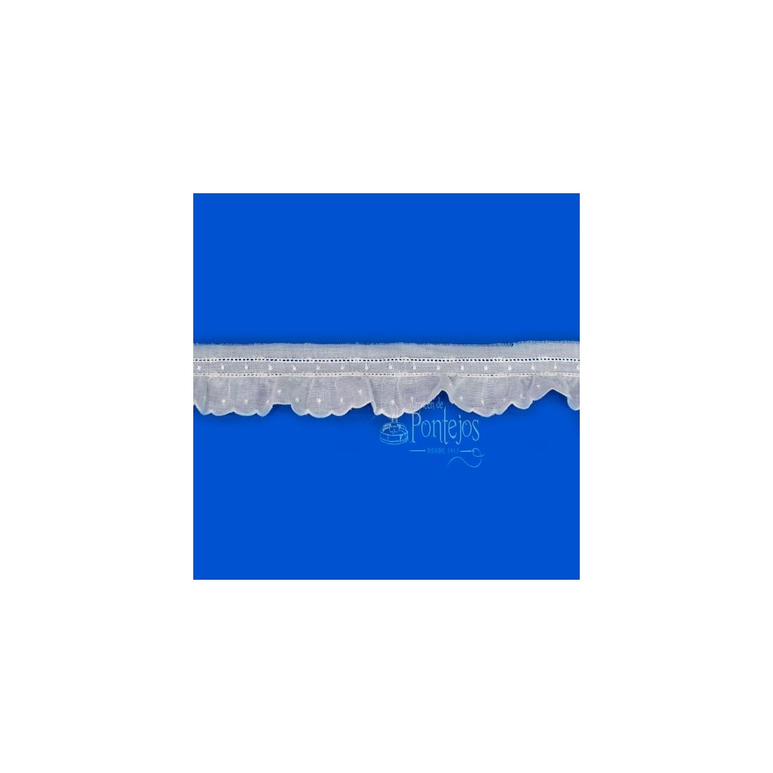 If you would like more information about colours or the product in general, please contact us. here.White embroidered strip; lace, gathered. It has a width of 3,5cm.Precio per meter. The lace will be shipped without any cuts unless the quantity ordered is more than 11 meters.