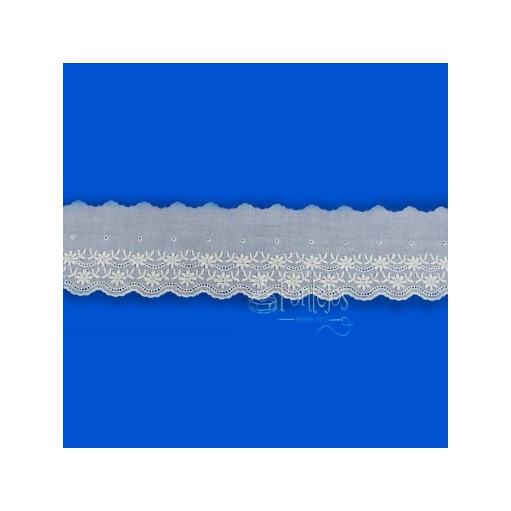 If you would like more information about colours or the product in general, please contact us. here.White embroidered strip; lace, plain. It has a width of 6,5cm.Precio per meter. The lace will be sent without any cut unless the quantity ordered is more than 13 meters.