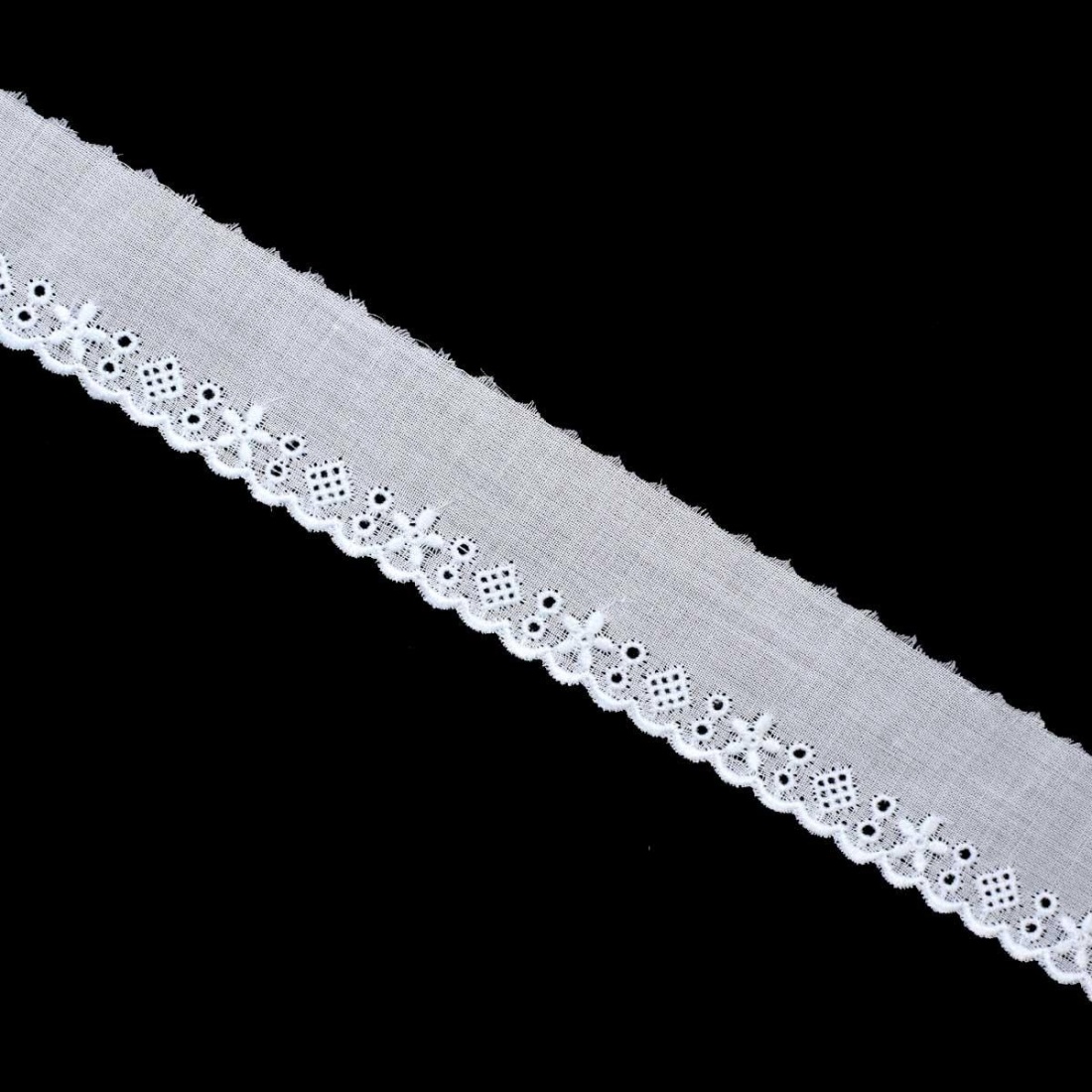 If you would like more information about colours or the product in general, please contact us. here.Embroidered lace in white color. It measures 3cm of total width. This lace, with floral motifs and small openwork is perfect for all kinds of uses. Ideal for sewing on any tablecloth, t-shirt, dress, quilt... It is a lace with a high quality finish. Price per meter.