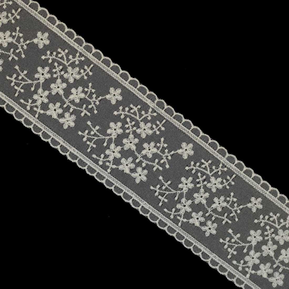 Double embroidered tulle lace in ecru color. It measures 6cm wide. This embroidered tulle is perfect to give elegance to your garments. Perfect to put on all kinds of dresses, shirts, suits and ceremony accessories. The embroidered tulle is used to lengthen garments or as a decorative element. High quality finish. Price per meter.