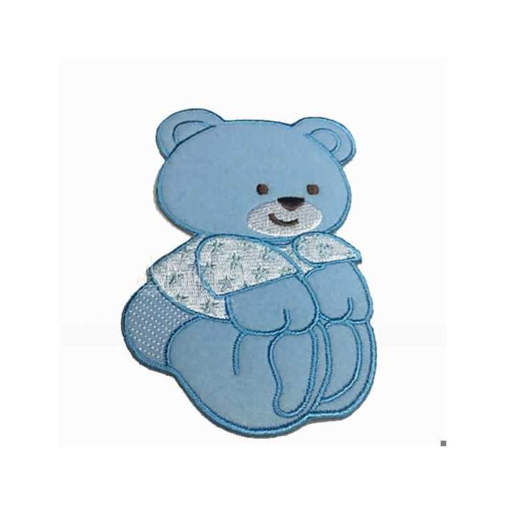 If you would like more information about colours or the product in general, please contact us. here.Adhesive embroidered appliqués are glued with an iron without steam, can also be sewn. Bear in blue color, measures approx. 6.5m wide and 11cm long. Price per unit.