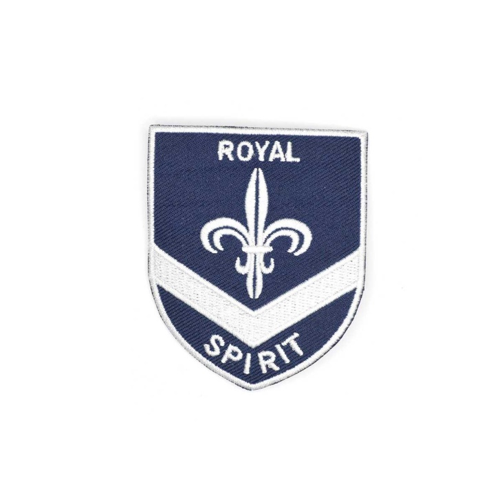 Distinctive heat-adhesive patch in the shape of a shield with the phrase "Royal Spirit", ideal for customizing garments and accessories with an elegant and sporty style. It measures 7 x 5.5 cm and is available in different colors, making it a versatile choice for jackets, backpacks, sweatshirts or uniforms. It is easily applied with an iron and offers a strong, long-lasting hold on fabrics. Perfect for adding a distinctive touch of character to any garment.