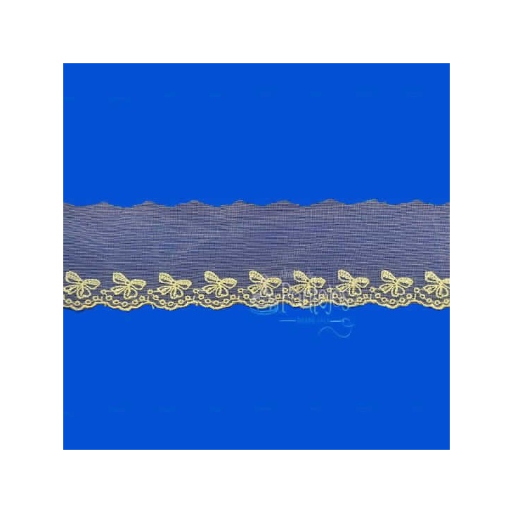 If you would like more information about colours or the product in general, please contact us. here.Nylon lace available in different colors. It has a very striking and colorful design with ribbons on its edge. Ideal to finish off any garment, accessory or hogard complement giving it a more personal and original touch. It measures 6cm in total width. Price per meter.