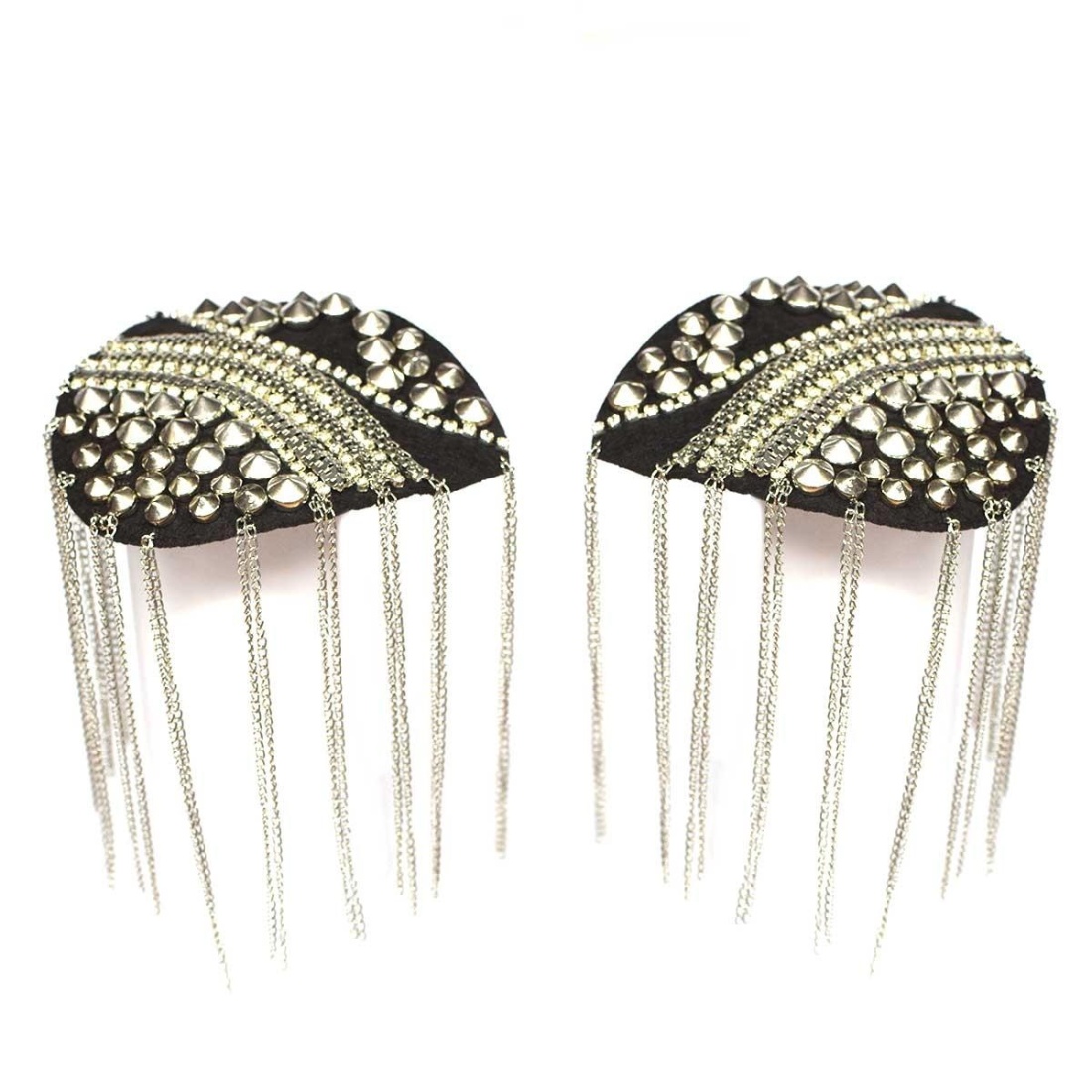 If you would like more information about colours or the product in general, please contact us. here.Shoulder pads with studs and rhinestones in gold or silver color. Thanks to this pair of shoulder pads you can give a different style to your jackets, coats, shirts or shirts. Its shape will fit perfectly to the hem of your garment. It measures 8cm long and 11cm wide, although it will adapt to your clothes with great ease. Its small stones and hanging chains give it a much more colorful and eye-catching touch. The chains are 11cm long.