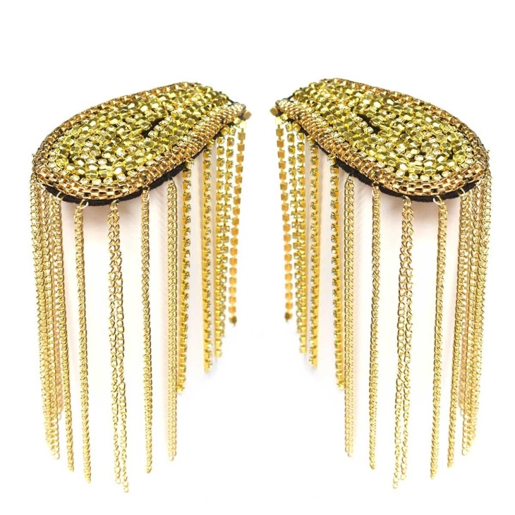 Shoulder pads with rhinestones and beads available in gold or silver color. With these shoulder pads you will be able to give a more personal and original touch to your garments. Ideal for sewing on jackets, coats, t-shirts or shirts. It measures 9cm long and 5cm wide. Its small shiny stones and chains make them stand out much more. Each chain is 11cm long. High quality finish.