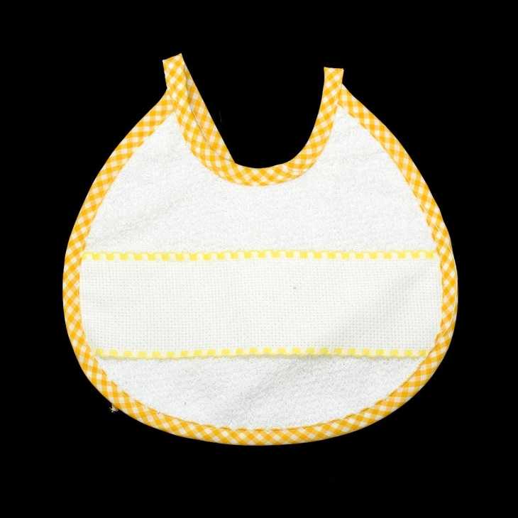 Si desea más información acerca de los colores o del producto en general póngase en contacto con nosotros aquí.Babero circulas con cinta de vichy en diferentes colores excepto en blanco. Tiene una cinta de panamá perfecta para bordar a punto de cruz iniciales, letras o motivos infantiles. Tiene un tacto suave, muy parecido al tejido de una toalla, capaz de absorber todas las manchas. Mide 19cm de alto y 19cm de ancho. Tiene una cinta con la que puedes atarlo fácilmente al cuello. La parte de atrás es de plástico impermeable. Composición 60% Poliéster y 40% Algodón. Puede lavarse a 40ºC y plancharse sin ningún problema.