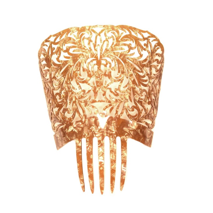 Peineta clásica de 25 × 27 cm, elaborada en material resistente y ligero, ideal para complementar peinados tradicionales, mantillas y estilismos festivos. Su diseño calado aporta elegancia y permite que se integre de forma natural en el recogido, proporcionando sujeción y comodidad durante horas.
