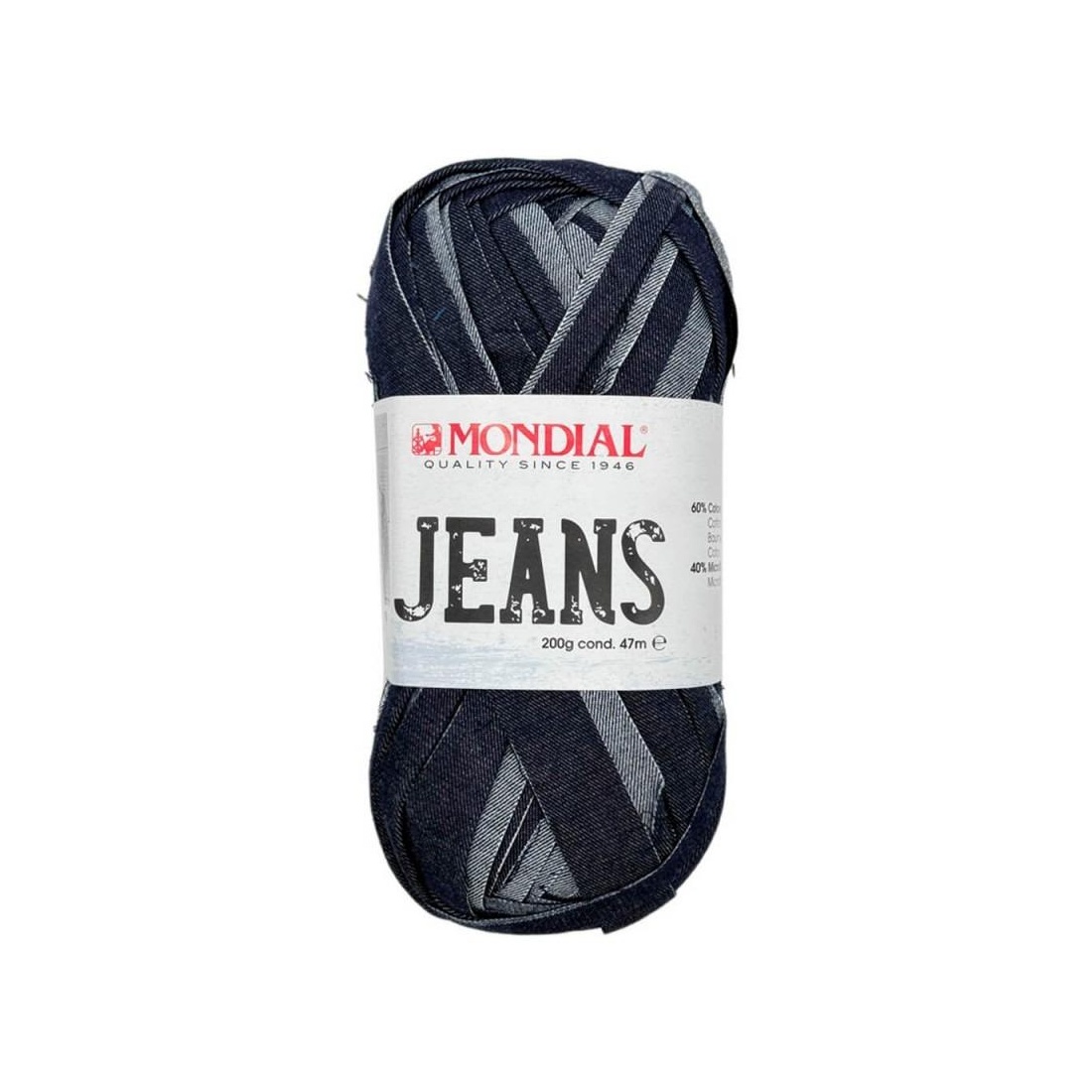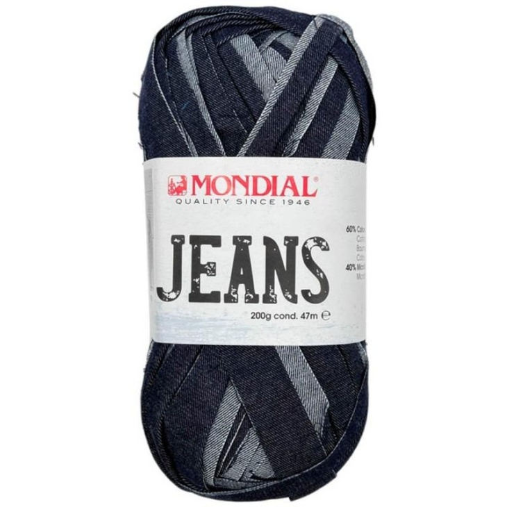 Ovillo Jeans de Mondial, un hilo de 200 gramos disponible en diferentes colores y pensado para quienes buscan un acabado moderno con efecto denim en sus proyectos de punto y ganchillo. Su mezcla de 60% algodón y 40% microfibra ofrece una cinta suave, resistente y con un tacto muy agradable, ideal para crear bolsos, mochilas, cestas, alfombras y complementos decorativos con cuerpo y estilo.