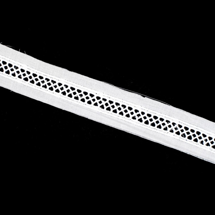 Tira bordada de 2,5 cm de ancho, ideal para aportar un acabado delicado y decorativo a prendas y proyectos de costura.