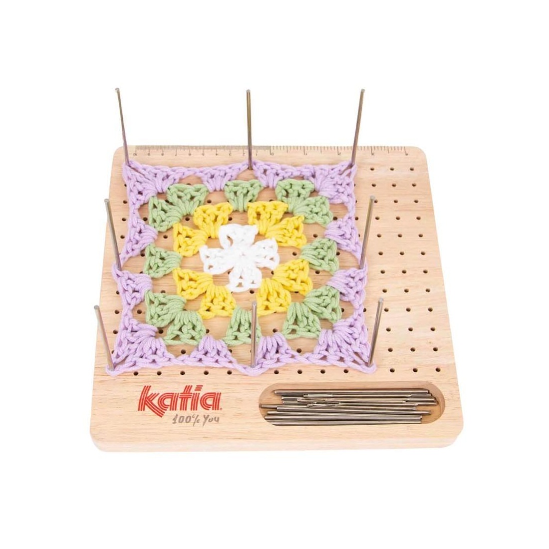 Consigue granny squares uniformes, bien definidos y listos para unir con este bloqueador de Katia, una herramienta práctica para amantes del crochet que buscan resultados impecables.