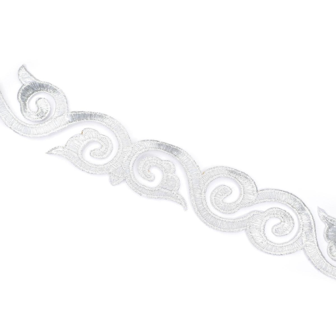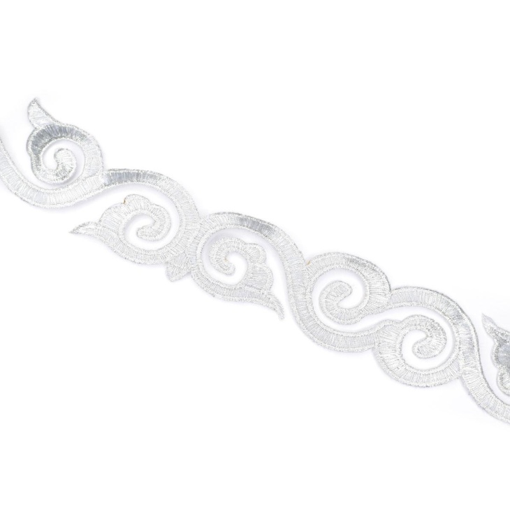 If you would like more information about colours or the product in general, please contact us. here.Decorative gallon available in golden color and silver color, with a total width of 5.5 cm, ideal to provide an elegant and ornamental touch to garments, accessories and sewing projects. Its design of embroidered waves and intertwined curved forms creates a sophisticated effect that enhances any clothing, from regional costumes to scenic costumes or textile decoration.