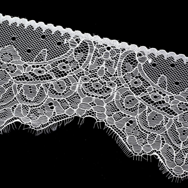 Soft and elegant nylon lace with a total width of 8 cm, ideal to provide a decorative and delicate finish to all types of garments and sewing projects. Its decorative frame with floral details and festonated edges gives it a refined and classic appearance, perfect for dresses, blouses, children's clothing, ceremony suits, underwear or textile decoration items.