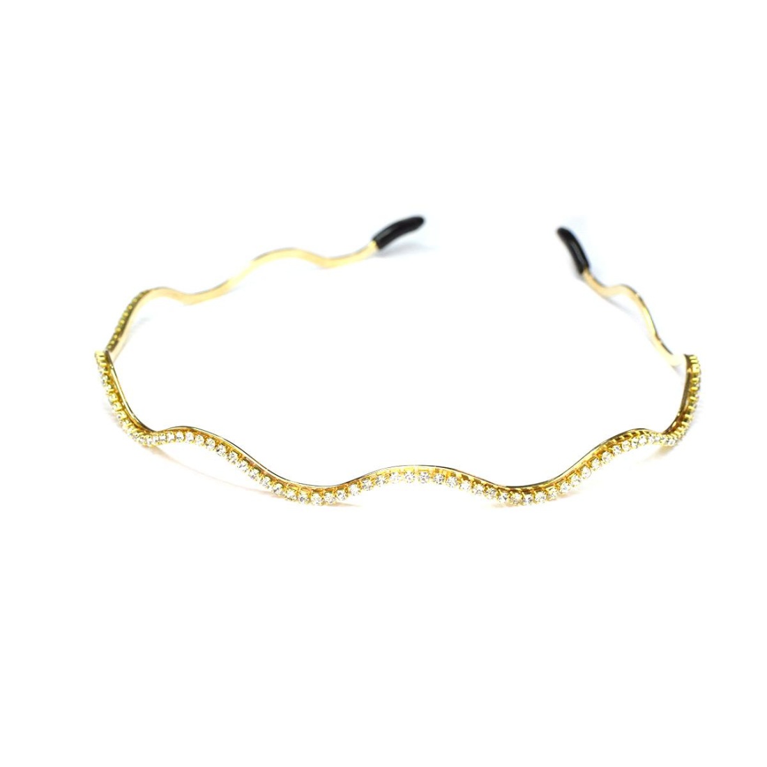 The headband is made of high quality, resistant and flexible golden metal, with a row of transparent strass stones that reflect light with a delicate and elegant glitter. Its wavy shape adapts to the contour of the head, ensuring a firm clamping without exerting pressure.