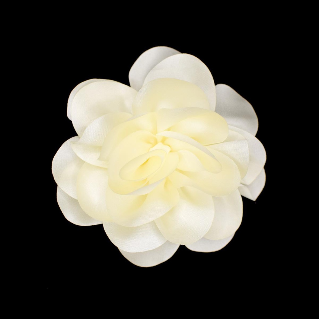 Decorative satin flower with clasp, 11 cm diameter, made with superimposed petals that provide volume and an elegant finish.