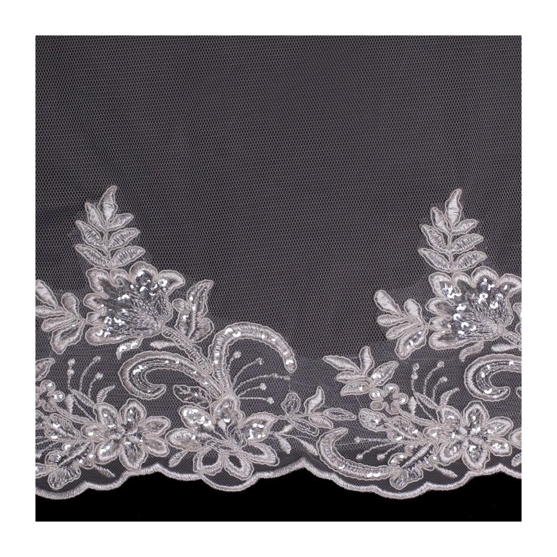 Cathedral cut bride veil made in tulle Silky with delicate auction floral lace dotted with transparent sequin, which brings a subtle and elegant brilliance to the bridal set.