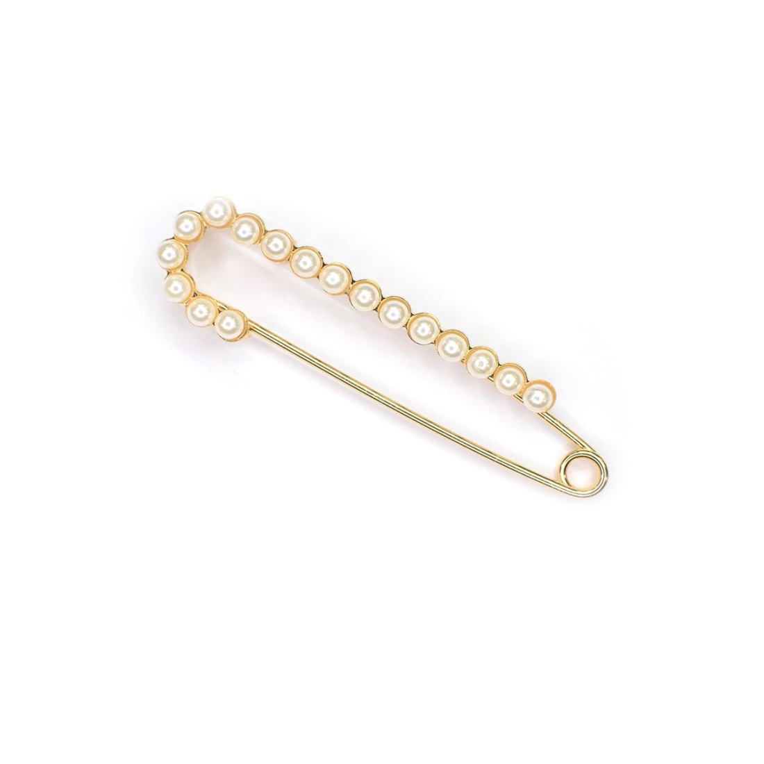 Su diseño incorpora una estructura metálica resistente que garantiza una sujeción firme y segura, permitiendo fijarlo fácilmente sobre chaquetas, bufandas, mantones, abrigos o fulares. Las perlas decorativas alineadas a lo largo del cuerpo aportan un aire sofisticado, convirtiéndolo en un accesorio perfecto tanto para looks formales como para estilismos más casuales con un toque distinguido.