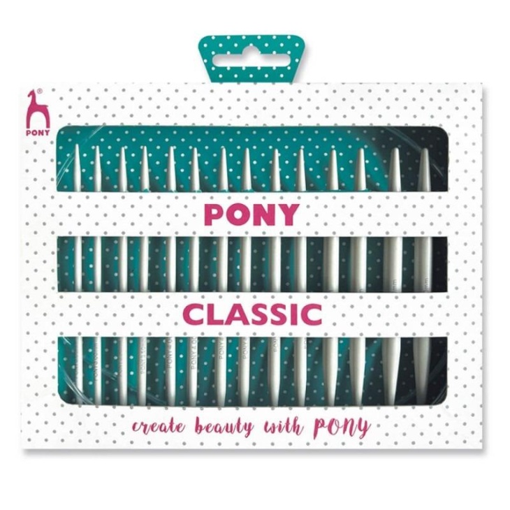 Si desea más información acerca de los colores o del producto en general póngase en contacto con nosotros aquí.El Set de Agujas Circulares Intercambiables Classic de Pony es una herramienta imprescindible para quienes buscan calidad, precisión y versatilidad en sus labores de punto. Este completo estuche incluye 7 pares de agujas circulares intercambiables cortas fabricadas en aluminio anodizado, un material resistente, ligero y muy agradable al tacto. Su acabado en color gris clásico y su superficie perfectamente lisa garantizan un deslizamiento fluido del hilo, lo que resulta especialmente útil en proyectos que requieren un alto nivel de detalle, como ropa de bebé, cuellos, calcetines o prendas con estructura tubular.