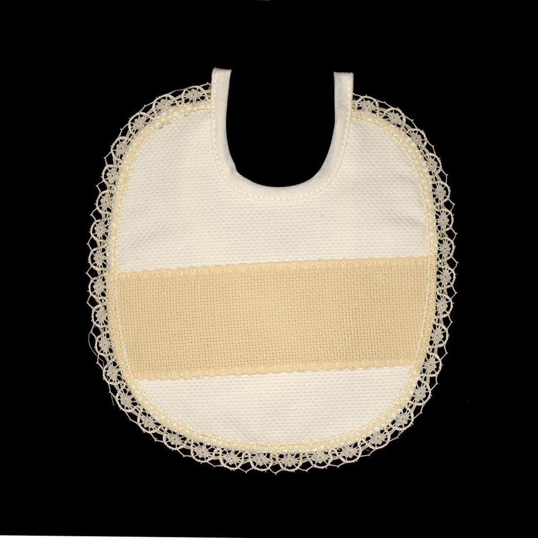 Babero de estilo clásico con delicado borde que imita el encaje de bolillos, aportando un acabado elegante y tradicional. Su tejido suave y absorbente es perfecto para el día a día, mientras que la franja panamá permite personalizarlo con bordados, nombres o iniciales. Ideal como detalle para bebés o para crear un conjunto artesanal único.