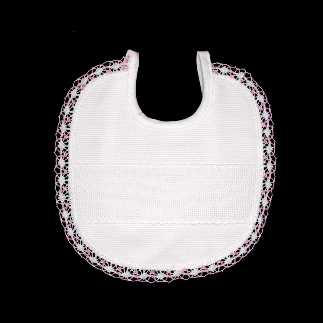 Babero de estilo clásico con delicado borde que imita el encaje de bolillos, aportando un acabado elegante y tradicional. Su tejido suave y absorbente es perfecto para el día a día, mientras que la franja panamá permite personalizarlo con bordados, nombres o iniciales. Ideal como detalle para bebés o para crear un conjunto artesanal único.
