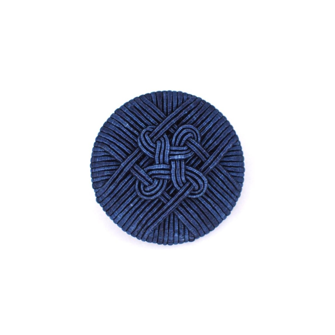 Botón de pasamanería decorativo, elaborado con cordón trenzado y diseño clásico entrelazado, ideal para aportar un acabado elegante y artesanal a tus prendas y proyectos de confección.