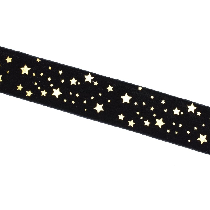 Una cinta de terciopelo con estrellas doradas de 4 cm de ancho, perfecta para quienes buscan un adorno versátil, resistente y elegante para dar un aire festivo y sofisticado a sus creaciones textiles o decorativas.