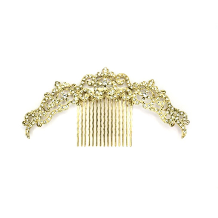 Si desea más información acerca de los colores o del producto en general póngase en contacto con nosotros aquí.Peineta metálica disponible en color dorado y plateado, un accesorio elegante y atemporal perfecto para dar un acabado sofisticado a recogidos y peinados de fiesta. Con unas medidas de 13,5 cm x 6,5 cm, su diseño destaca por las pequeñas piedras de cristal brillante que aportan destellos de luz y realzan la belleza del peinado en ocasiones especiales.