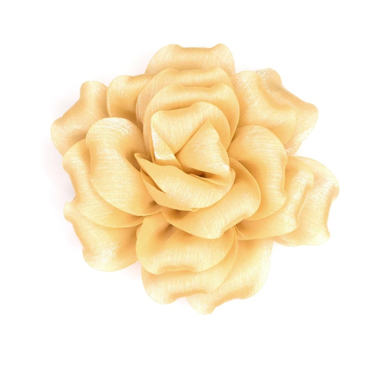 Fabricada en organza de alta calidad, un tejido fino y semitransparente con sutil reflejo, mantiene su forma sin perder ligereza, ofreciendo una apariencia delicada y elegante. Sus pétalos superpuestos, de bordes suaves y bien definidos, recrean el aspecto natural de una flor real, aportando un acabado artesanal y sofisticado.