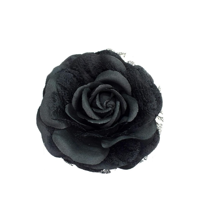 Tocado de rosa negra confeccionado en tejido suave y con un acabado elegante, perfecto para dar un toque distinguido a peinados, looks de fiesta o estilismos más formales.
