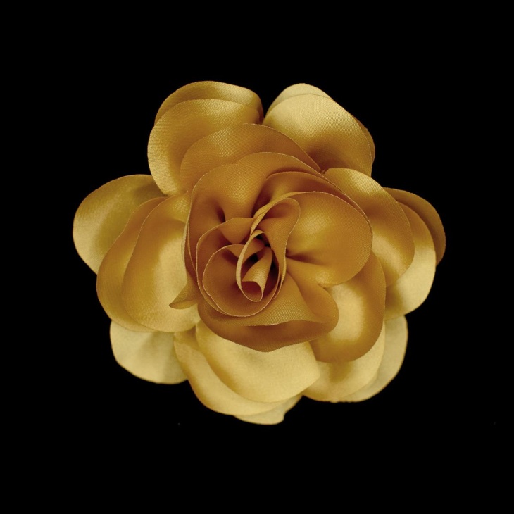 Flor decorativa de satén con broche, de 11 cm de diámetro, confeccionada con pétalos superpuestos que aportan volumen y un acabado elegante.