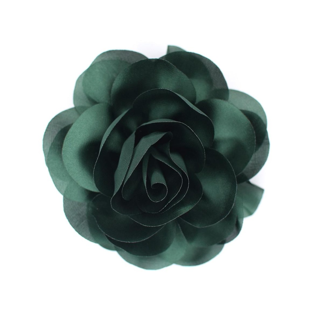 Flor decorativa de satén con broche, de 11 cm de diámetro, confeccionada con pétalos superpuestos que aportan volumen y un acabado elegante.