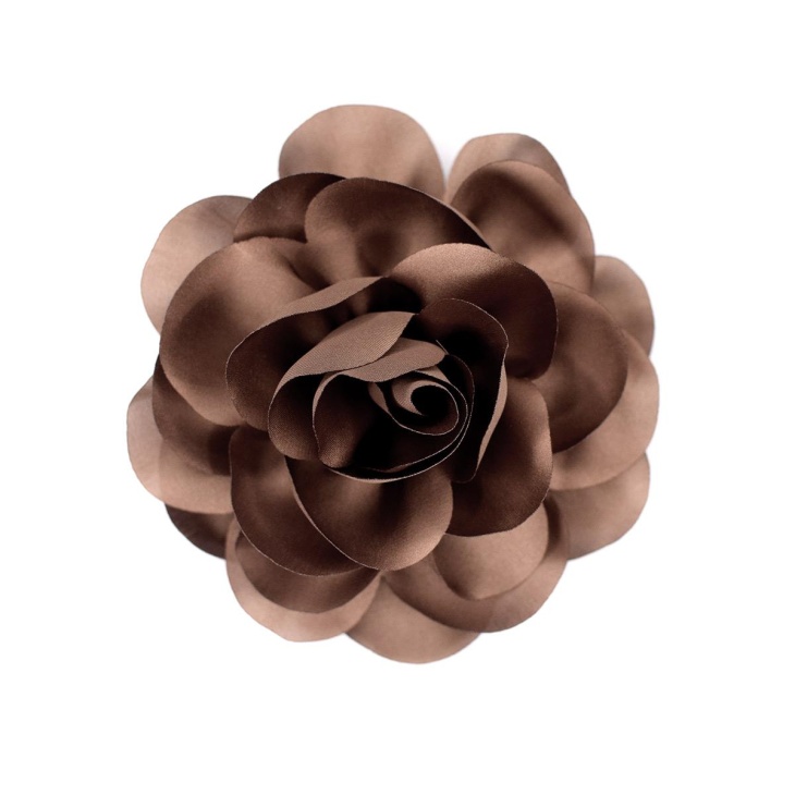 Flor decorativa de satén con broche, de 11 cm de diámetro, confeccionada con pétalos superpuestos que aportan volumen y un acabado elegante.