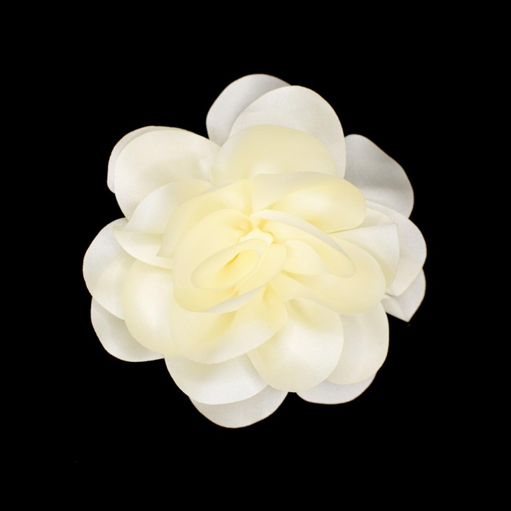 Flor decorativa de satén con broche, de 11 cm de diámetro, confeccionada con pétalos superpuestos que aportan volumen y un acabado elegante.