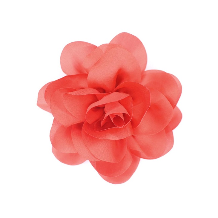 Flor decorativa de satén con broche, de 11 cm de diámetro, confeccionada con pétalos superpuestos que aportan volumen y un acabado elegante.