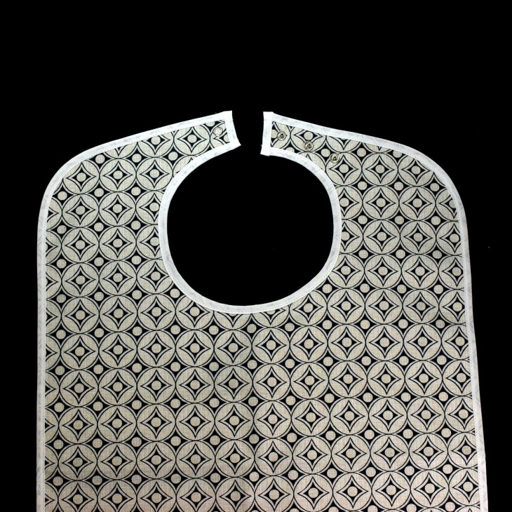 Si desea más información acerca de los colores o del producto en general póngase en contacto con nosotros aquí.Práctico y elegante babero para adultos con estampado geométrico, ideal para proteger la ropa durante las comidas sin renunciar al estilo. Fabricado con materiales resistentes, ligeros y fáciles de limpiar, este babero ofrece una excelente cobertura y comodidad, adaptándose perfectamente al contorno del cuello gracias a su cierre con corchetes ajustables.