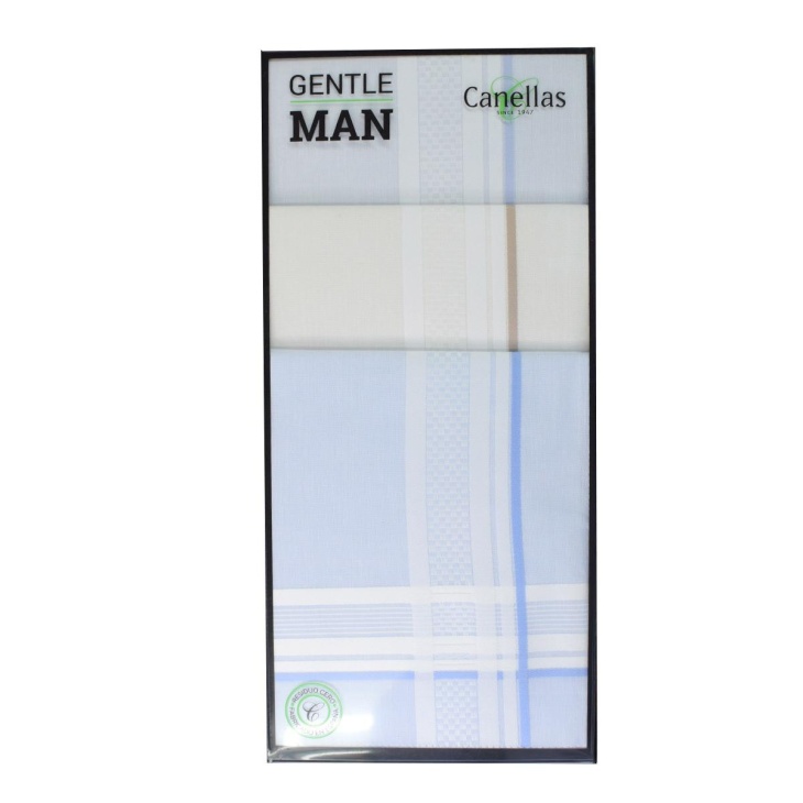 Paquete de 3 pañuelos para caballero. Incluye 1 pañuelo beige y 2 pañuelos celestes. Tienen pequeños cuadrados bordados que le dan un acabado más elegante y sofisticado. Están hechos de fibras naturales (100% Algodón) y son muy suaves y sedosos al tacto. Cada pañuelo mide 44cm de lado. Se presentan en un paquete listo para envolver y regalar.