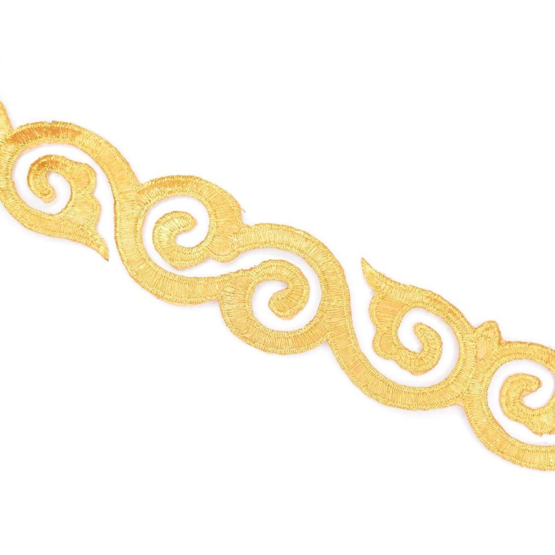 Si desea más información acerca de los colores o del producto en general póngase en contacto con nosotros aquí.Galón decorativo disponible en color dorado y color plateado, con un ancho total de 5,5 cm, ideal para aportar un toque elegante y ornamental a prendas, complementos y proyectos de costura. Su diseño de ondas bordadas y formas curvas entrelazadas crea un efecto sofisticado que realza cualquier confección, desde trajes regionales hasta vestuario escénico o decoración textil.