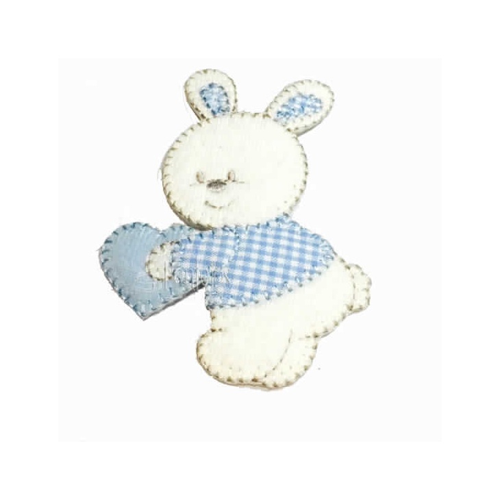 Si desea más información acerca de los colores o del producto en general póngase en contacto con nosotros aquí.Aplicaciones bordadas adhesivas ojo se pegan con plancha sin vapor, también se deja coser. Conejito corazón en color azul medidas aprox. 5,5cm de ancho y 8cm de largo. Precio unidad.