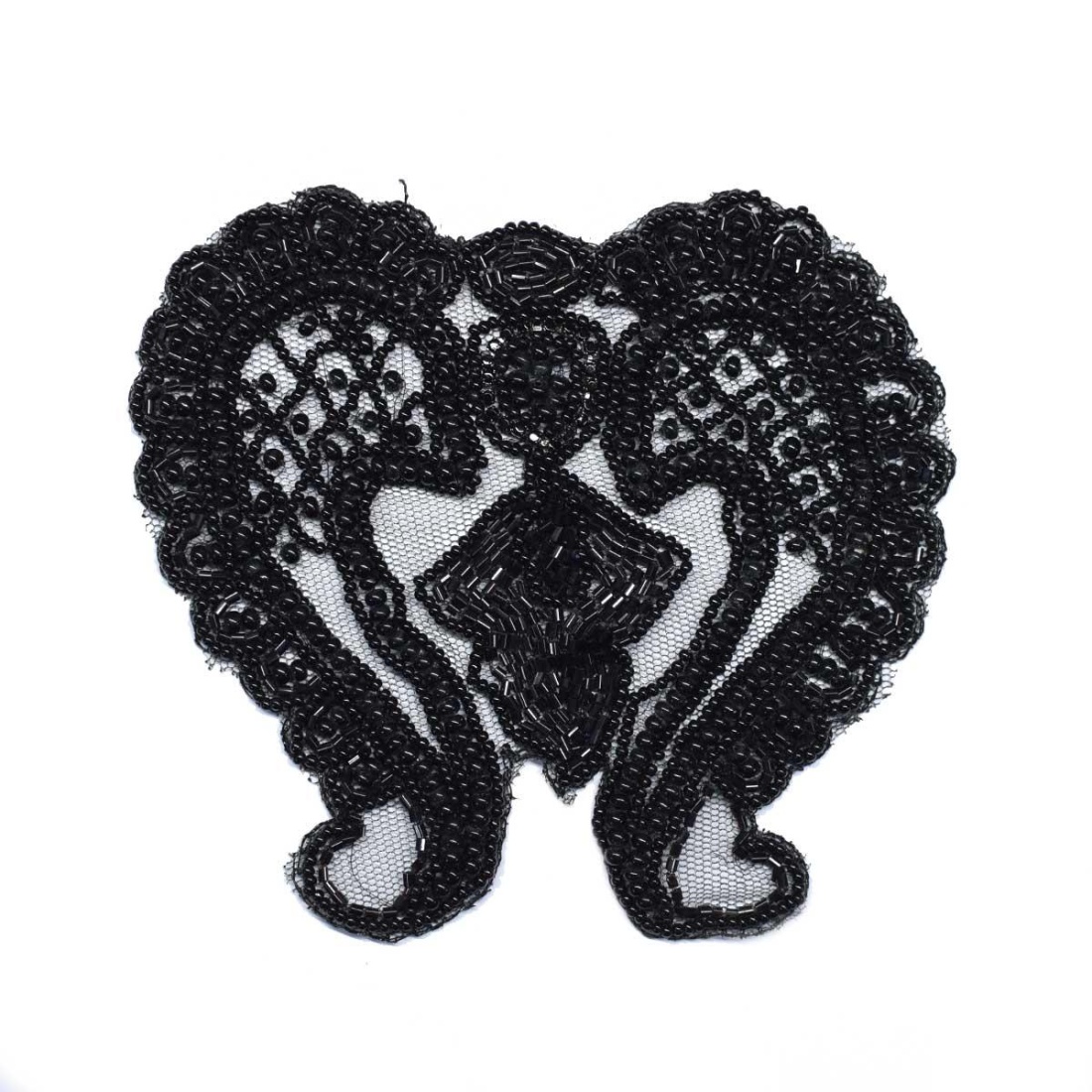Aplicación de pedrería disponible en tres colores diferentes. Mide 10.5cm de ancho y 12cm de largo. Esta aplicación de fantasía es perfecta para customizar o decorar tu ropa o accesorios. Ideal para coser sobre vestidos, camisetas, camisas, bolsos, colchas... Es una aplicación hecha a mano de gran calidad.