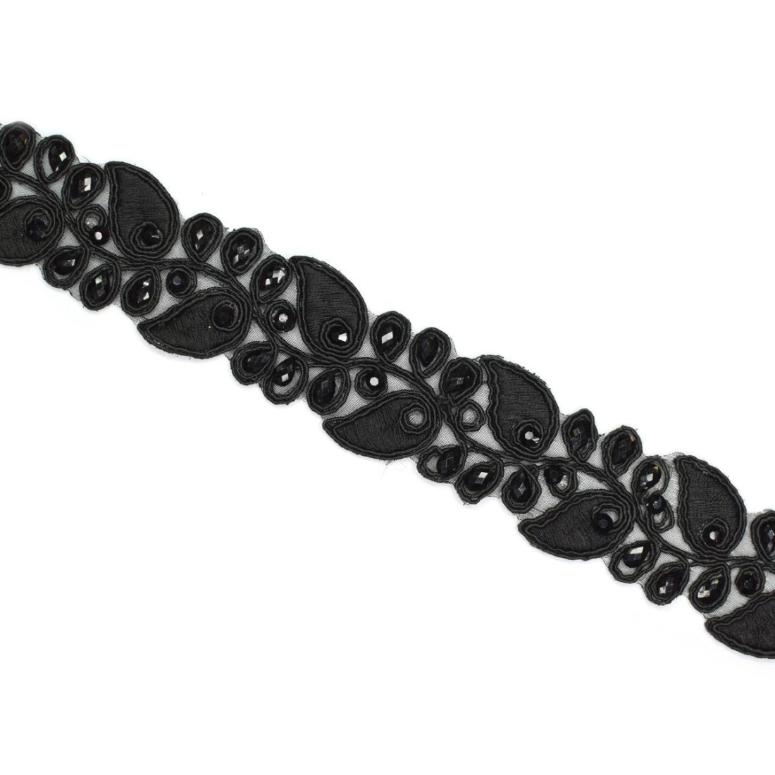 Esta pasamanería de pedrería en color negro es una elección elegante y sofisticada para dar un toque de distinción a prendas, complementos y proyectos de decoración. Con un ancho total de 3 cm, su diseño combina bordado sobre tul con pequeñas cuentas de pedrería negras que aportan brillo, textura y un acabado lujoso a cualquier superficie donde se aplique.