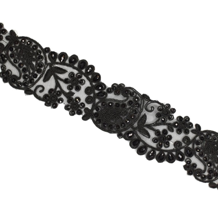 Esta cinta de pasamanería negra con pedrería no solo embellece, sino que transforma cualquier prenda o accesorio en una pieza única y exclusiva.