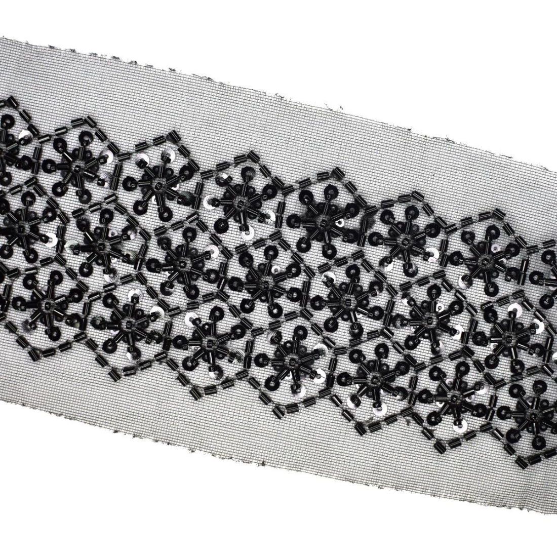 Pasamanería fantasía en color negro (col. 999), con un ancho aproximado de 11,5 cm, elaborada sobre base textil y decorada con un elegante trabajo de pedrería y abalorios que forman un diseño floral sofisticado y con volumen.