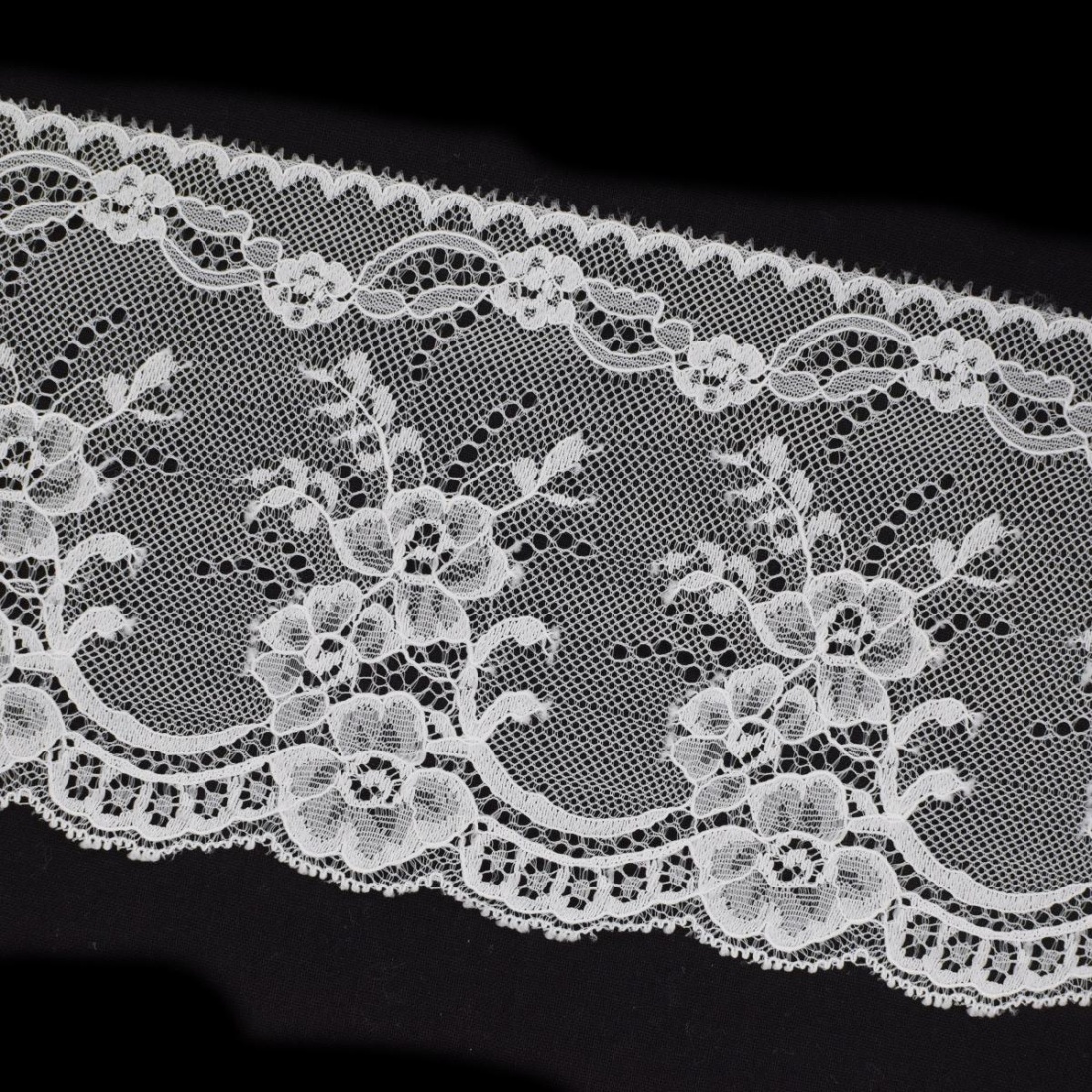Si desea más información acerca de los colores o del producto en general póngase en contacto con nosotros aquí.Amplia y elegante puntilla de nylon con un ancho total de 11 cm, perfecta para añadir un toque decorativo y sofisticado a cualquier proyecto de costura o confección. Su tejido ligero y semitransparente destaca por su suavidad y su delicado diseño calado, ideal para decorar vestidos, trajes de ceremonia, ropa de hogar, lencería o manualidades.