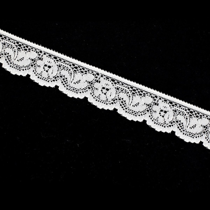 Ideal para batas, vestidos de bebé, lencería, ropa de hogar o labores creativas, esta puntilla de nylon blanca combina ligereza y resistencia, ofreciendo un acabado refinado y duradero. Su textura suave y flexible facilita la costura y la aplicación en todo tipo de tejidos.