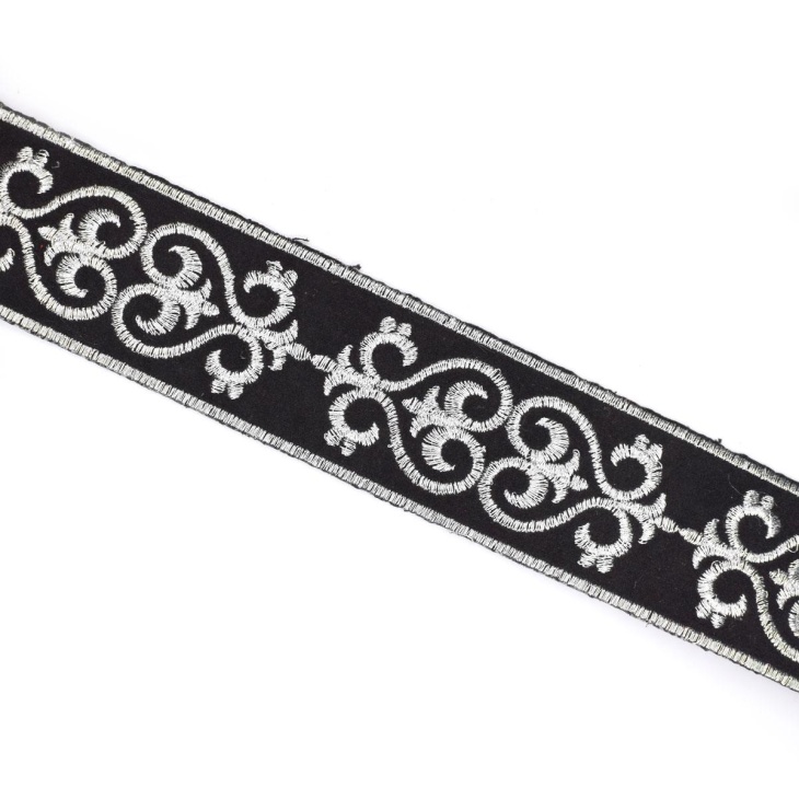 Cinta tapacosturas termoadhesiva con diseño ornamental sobre fondo negro, disponible en dos acabados: dorado y plateado, perfecta para decorar, reforzar o rematar prendas y proyectos de costura con un toque elegante y profesional. Con un ancho total de 4,5 cm, esta cinta combina la funcionalidad de una aplicación termoadhesiva con la belleza del bordado decorativo, aportando brillo y distinción a cualquier tejido.