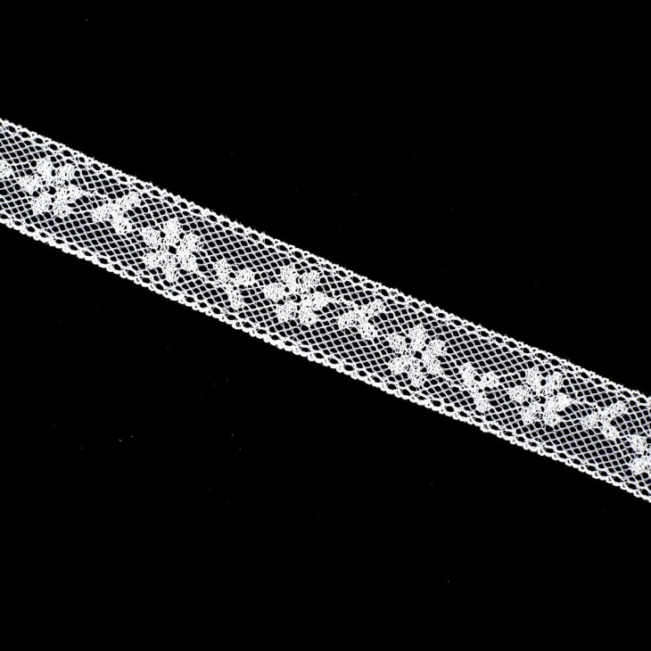 Un entredós valencienne de 1,8 cm en color blanco, vendido por metros, que combina elegancia, calidad y tradición, ideal para quienes buscan un detalle decorativo con el encanto del encaje clásico y la precisión del trabajo artesanal.
