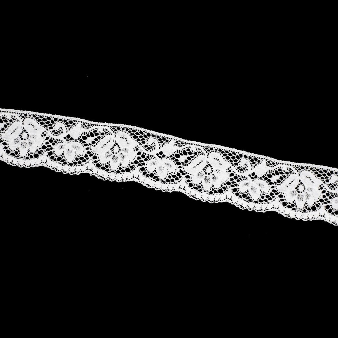 Esta puntilla valencien blanca presenta un diseño clásico y delicado, con un dibujo ornamental que aporta ligereza y elegancia a cualquier proyecto de costura. Con un ancho de 3,3 cm, es ideal para remates decorativos visibles que buscan un equilibrio entre protagonismo y sutileza.