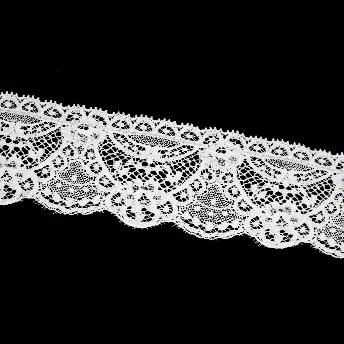 Si desea más información acerca de los colores o del producto en general póngase en contacto con nosotros aquí.Esta puntilla valencien blanca destaca por su diseño clásico y elegante, con un delicado dibujo ornamental que aporta ligereza y sofisticación a cualquier proyecto de costura. Con un ancho de 6 cm, es ideal para remates decorativos visibles que buscan protagonismo sin perder finura.
